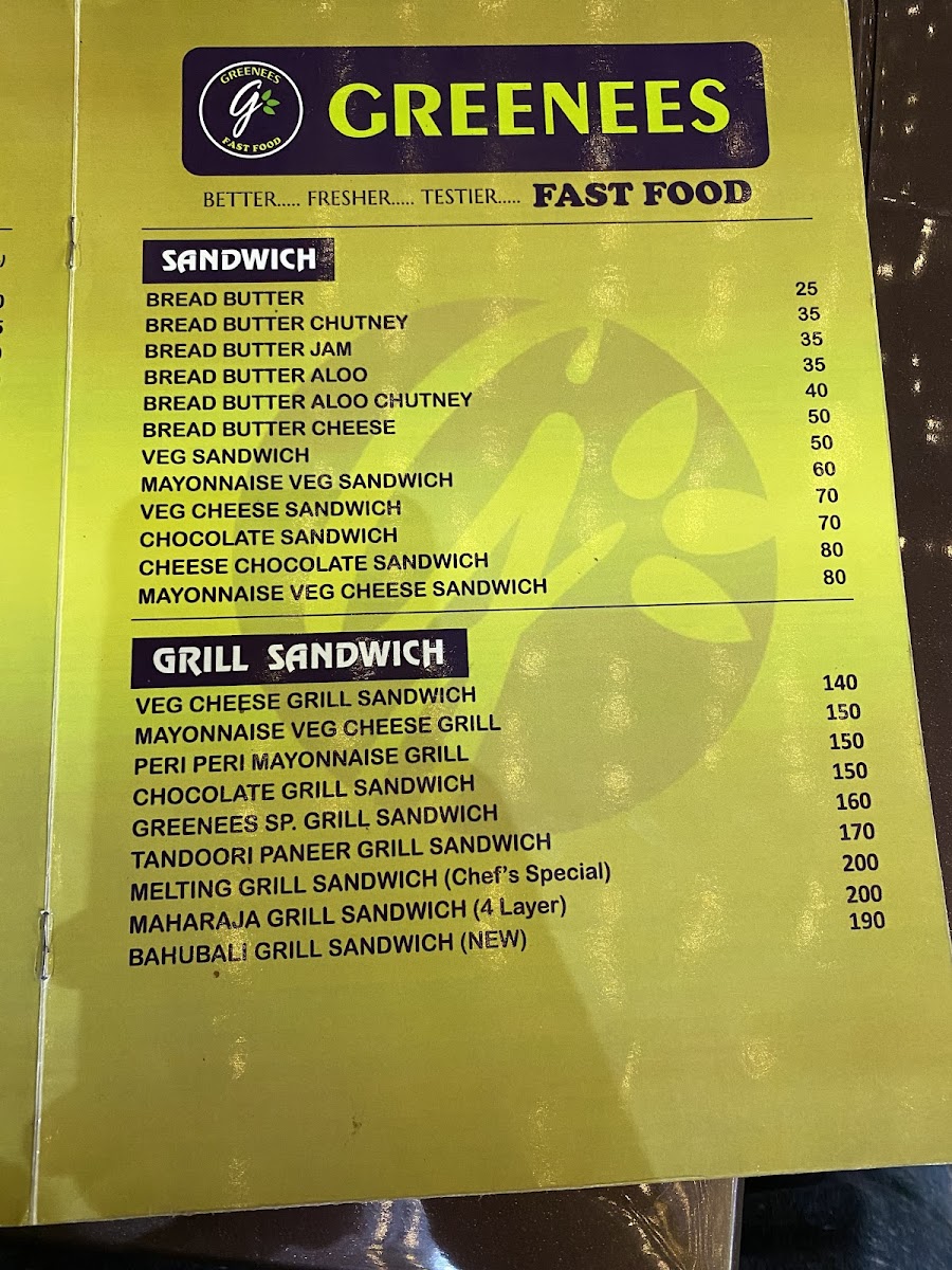 But the delights don’t stop at burgers—Greenees' sandwich selection showcases creativity and taste with options like the Chocolate Sandwich and Mayonnaise Veg Cheese Sandwich, both excellent choices for those seeking a sweet or savory snack. And for a delightful beverage, don’t miss their Greenees Sp. Hot Chocolate served in small and large sizes, offering a luxurious chocolate experience perfect for any time of day.